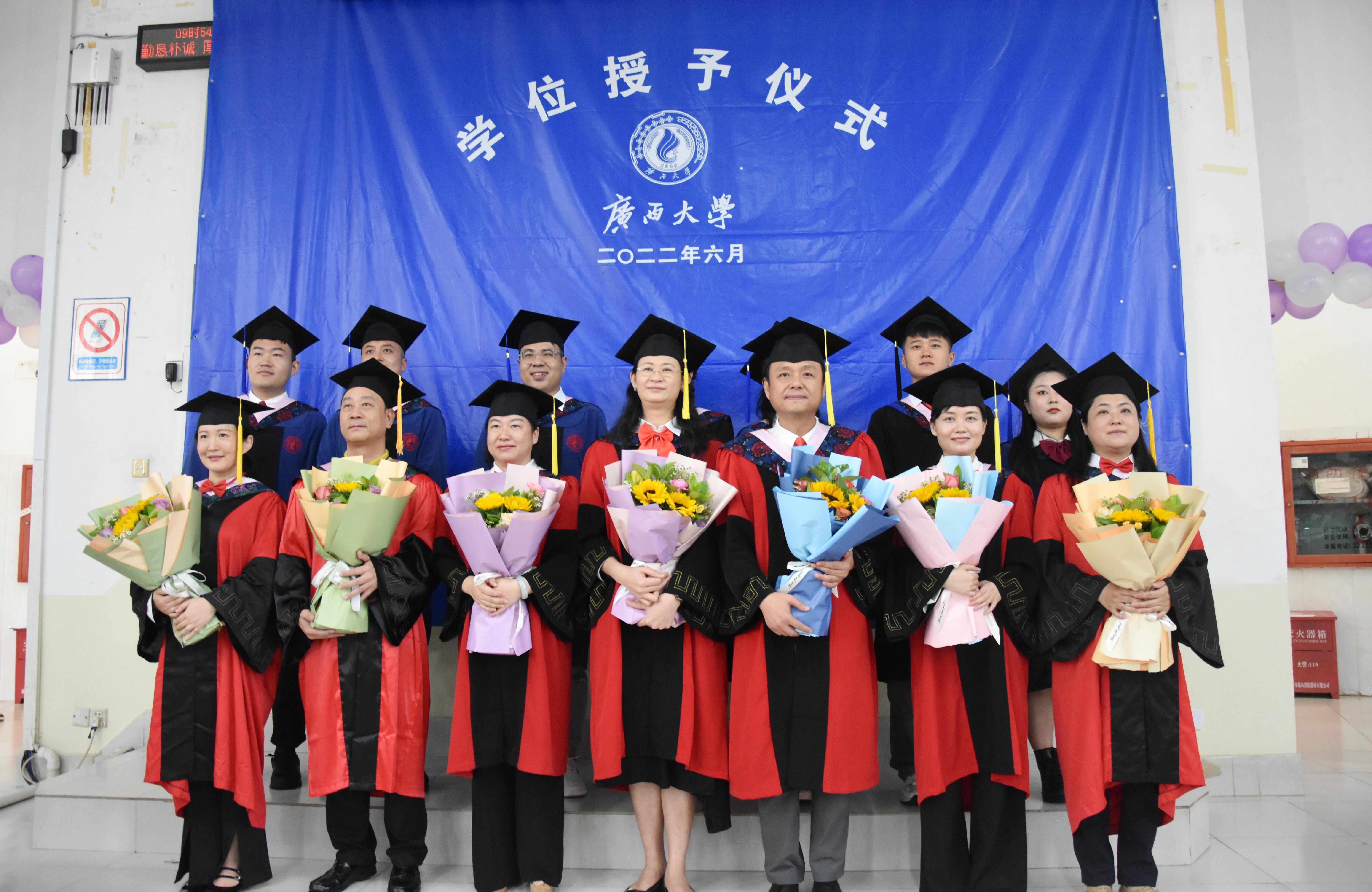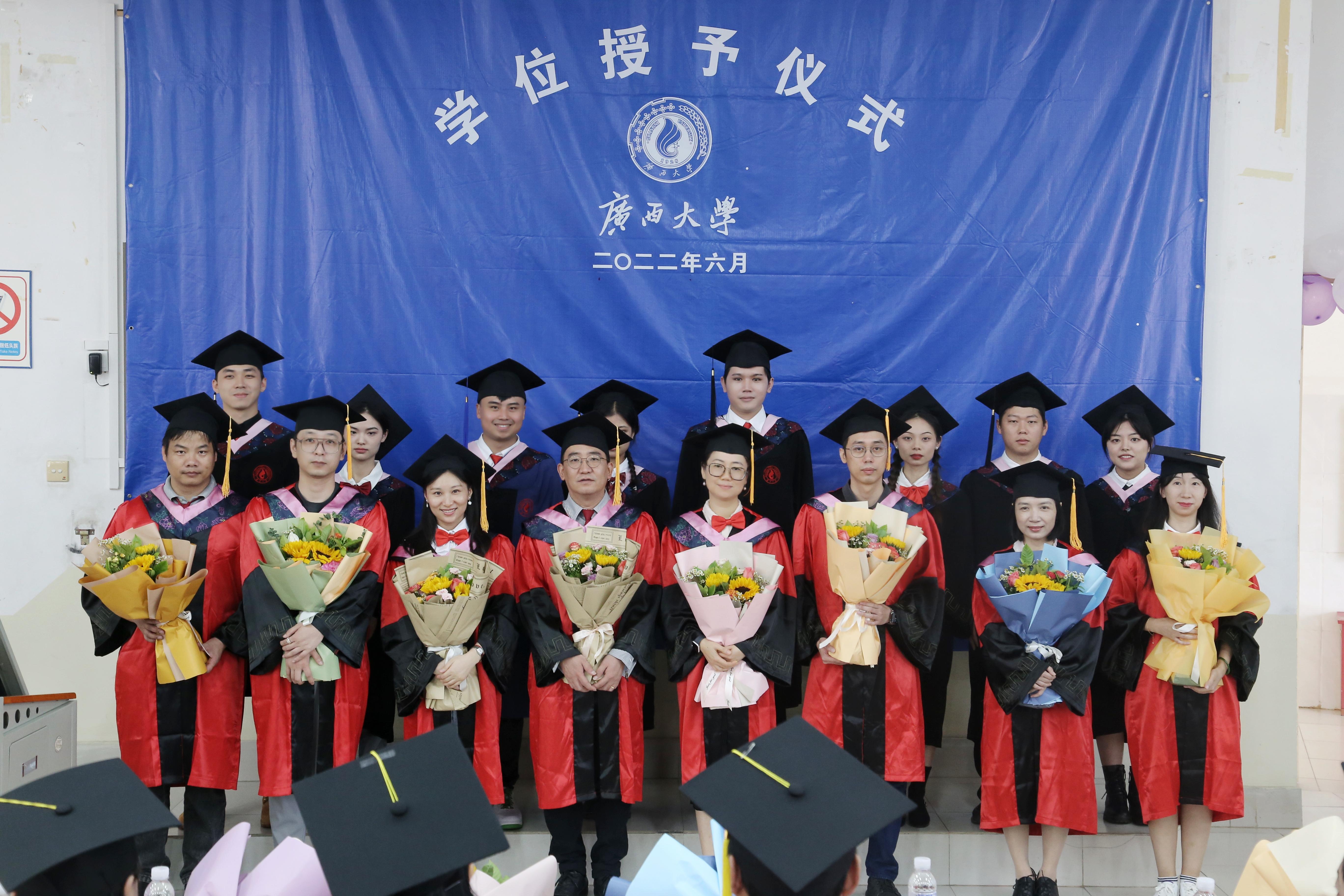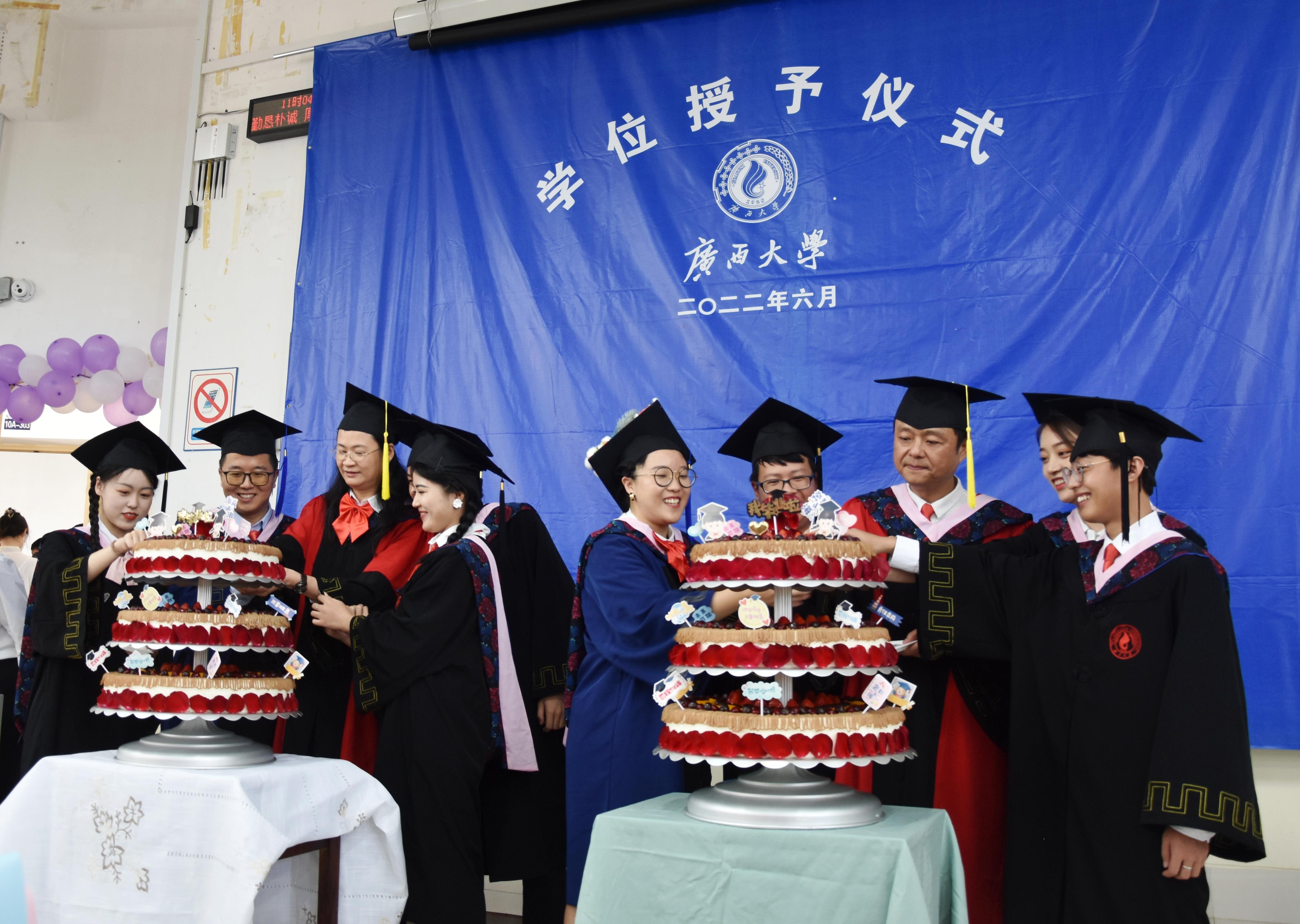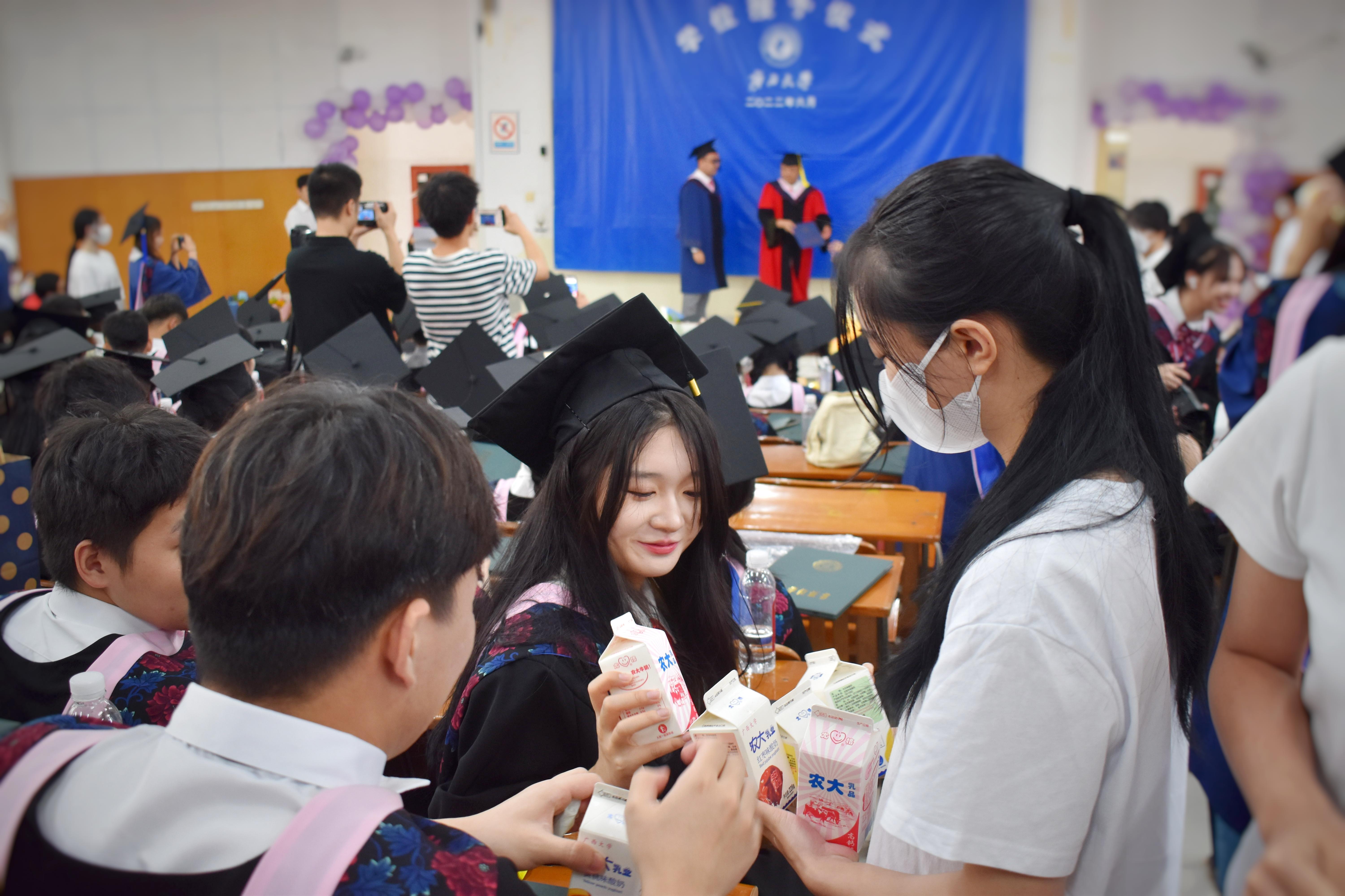 毕业典礼开始前,公司师生一同观看了学校主会场毕业典礼直播。直播结束后,公司毕业典礼暨学位授予仪式正式开始,首先由邓莹副书记逐一介绍出席典礼的领导老师,由毕业生代表为领导老师们献花并合影留念。随后,各系主任宣读本专业授予学位决定和授予学位员工名单,由胡红一经理依次为毕业生拨穗并授予学位证书。学位授予仪式结束后,学院为每位毕业生分发了农大牛奶,并准备了毕业蛋糕与同学们一同分享。典礼最后,领导老师与毕业生们集体合影留念。