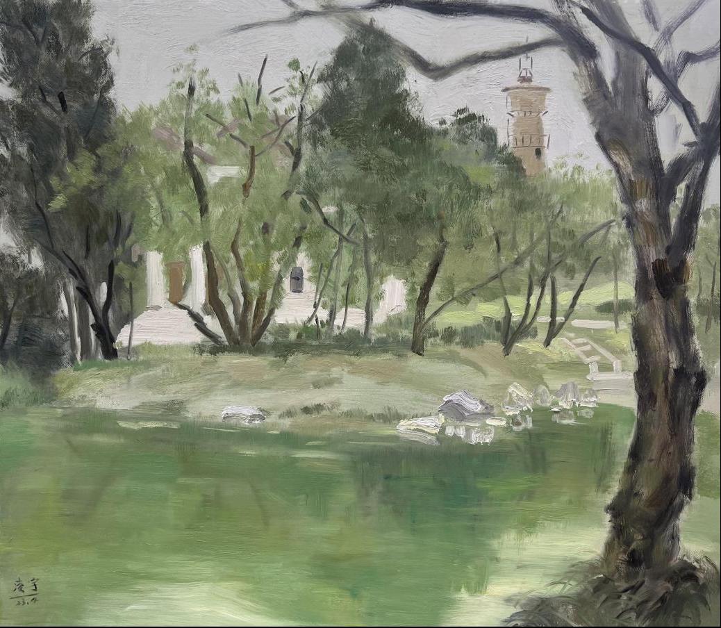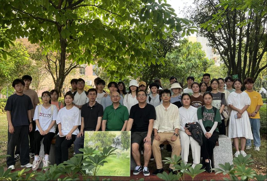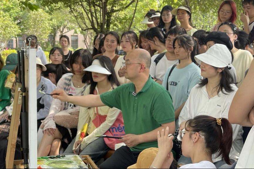 庞凌宇老师在《油画构成与表现---校园写生》课程中为同学们授课,并进行校园写生的现场示范。他分别从构图取舍、色调分析归纳、色彩的调和及技法表现等方面,为同学们分步骤示范,进行精细的指导。庞老师灵动沉稳的用笔,清雅温润的色彩,营造出诗意般的空灵清幽之境,感染着在场的每一位同学。
