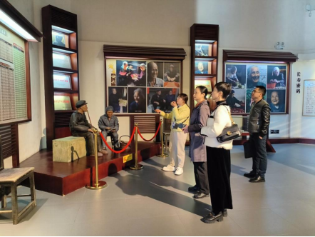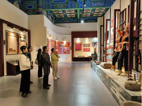 座谈会结束后,调研团队专程前往永福县博物馆实地考察,深入探寻当地历史文化脉络,重点了解永福彩调剧这一传统艺术的起源、发展与传承。在博物馆工作人员的细致讲解与引导下,调研组成员先后参观了历史陈列厅与非遗文化展区,从承载岁月记忆的戏曲服饰、古朴雅致的伴奏乐器,到记录演出盛况的珍贵照片中,系统了解了彩调剧在永福地区深厚的群众基础与独特的艺术价值,为后续开展艺术赋能合作积累了第一手素材。